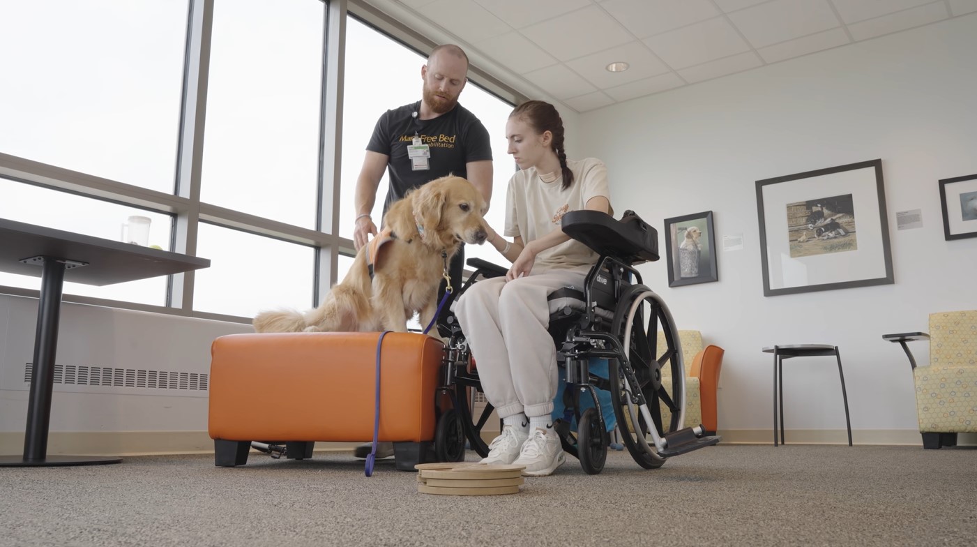 Children heal, learn and grow differently than adults. They explore the world through movement, curiosity, imagination and emotional connection. At Mary Free Bed Kids, we understand how to tailor therapy to a child’s unique emotional and developmental needs. The Animal-Assisted Intervention (AAI) Program blends evidence-based rehabilitation with the joy of interacting with specially trained therapy dogs. This unique program enhances movement, boosts confidence, reduces anxiety and helps children stay engaged during therapy in ways that feel natural, supportive and fun.